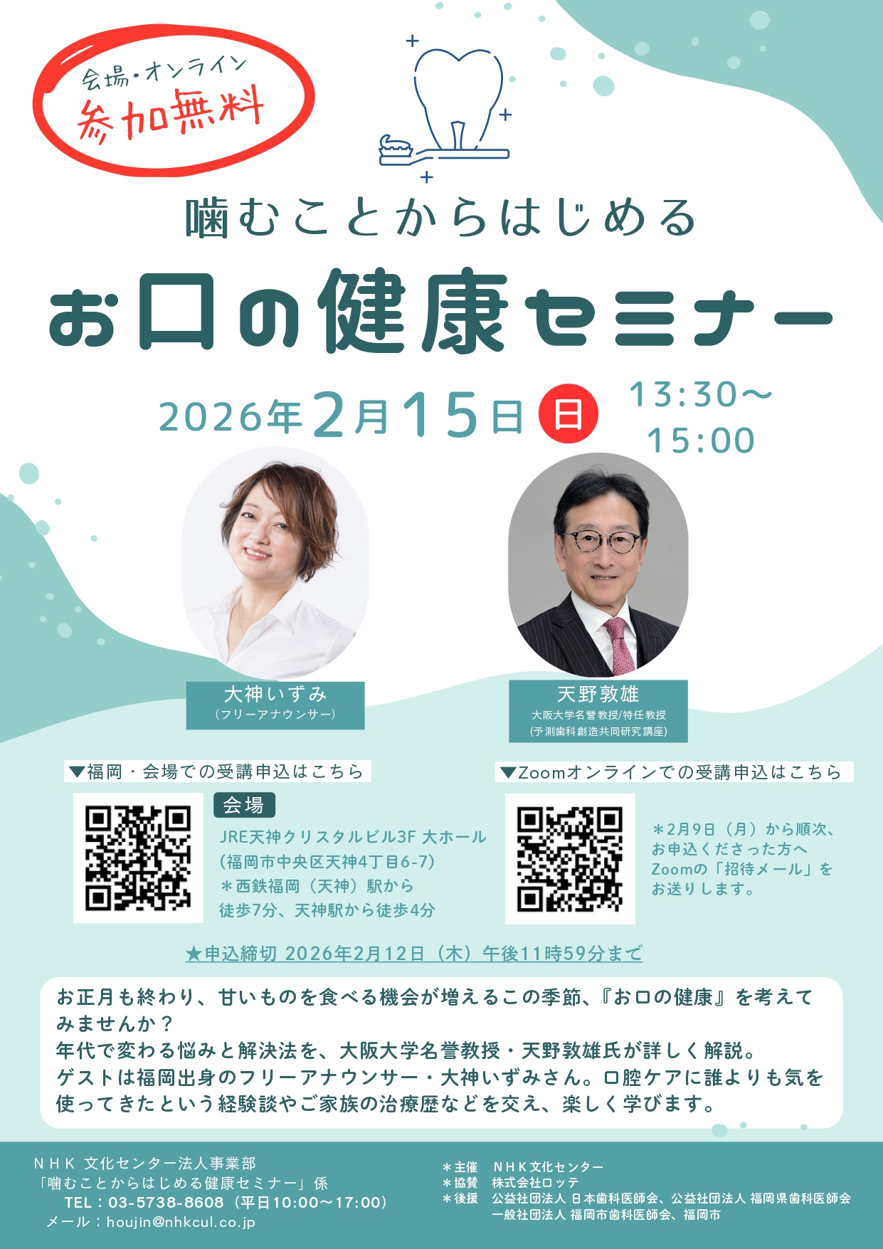 NHK文化センター主催「噛むことからはじめるお口の健康セミナー」が2月15日(日)に開催されますので、府民の皆さまにご案内いたします。