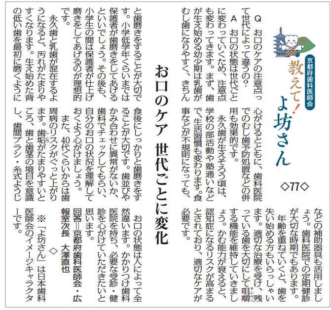 教えて!よ坊さん・77「お口のケア 世代ごとに変化」
