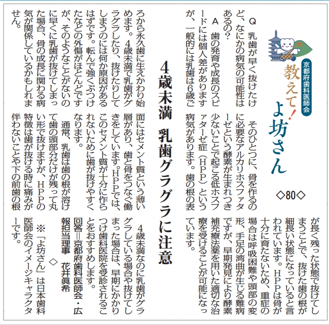 教えて!よ坊さん・80「4歳未満 乳歯グラグラに注意」