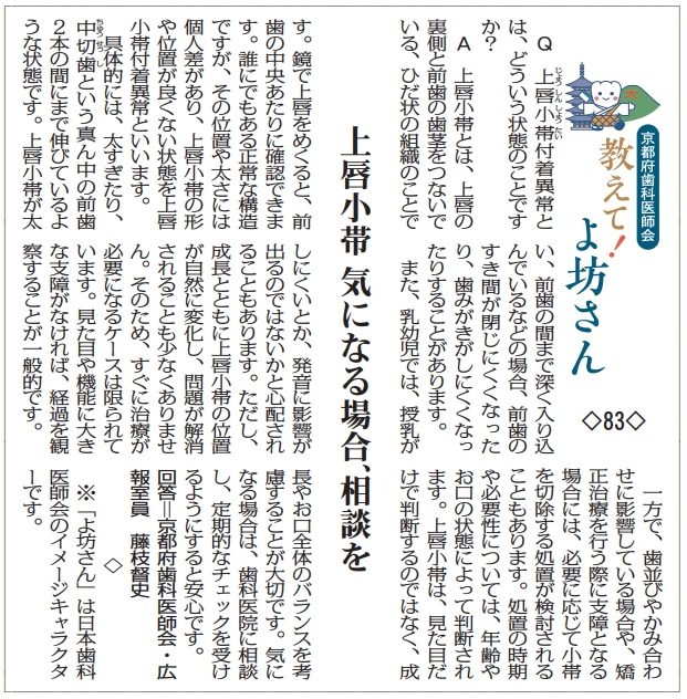 教えて!よ坊さん・83「上唇小帯 気になる場合、相談を」