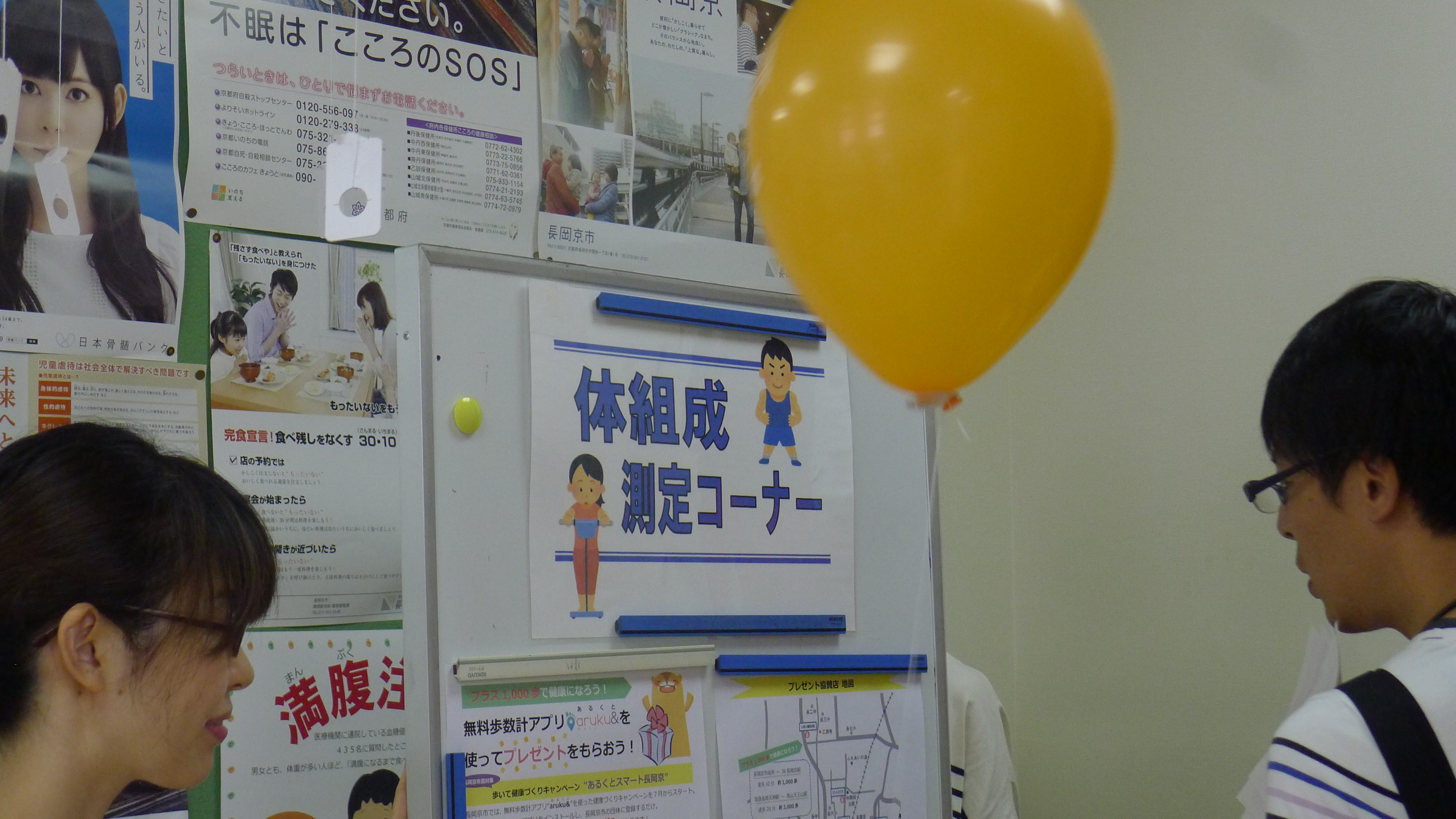 例年通り検診・口腔健康相談・咬合力検査・口臭検査、染め出し歯磨き指導が行われ、今年度から始まった訪問診療相談コーナー、乙訓薬剤師会による「お薬相談」のコーナーも賑わいを見せていました。また行政の協力で血管年齢測定や禁煙指導のコーナーも設けられました。
